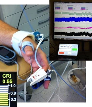 Compensatory Reserve Index (CRI) is an FDA cleared algorithm using noninvasive pulsatile continuous vital signals (PPG, ECG, CBP) to detect and monitor hemorrhage. The index value takes the range [0-1] trending intravascular volume proximity to hemodynamic decompensation (CRI=0), where CRI=1 is the normal, well hydrated state.